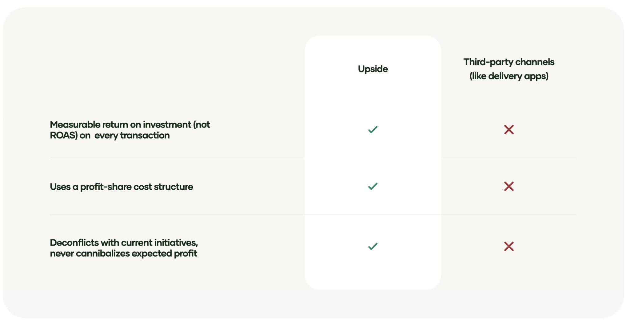 Upside's profit-share model ensures you only pay when we deliver proven incremental customers to your store. Unlike platforms that charge based on clicks, impressions, or total sales, Upside's cost structure is tied directly to the incremental profit we generate for your business.