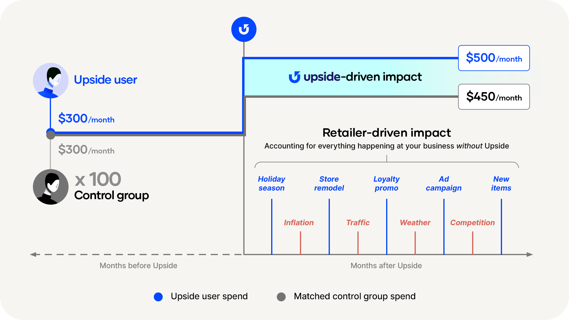 Upside uses test-versus-control analysis to prove which consumers are truly new to your store. When a customer claims an Upside offer, we build a profile based on their shopping behavior, then match them with 10 to 100 similar non-Upside users as a control group. We compare the Upside user's actual spending against what the control group represents they would have spent without Upside.