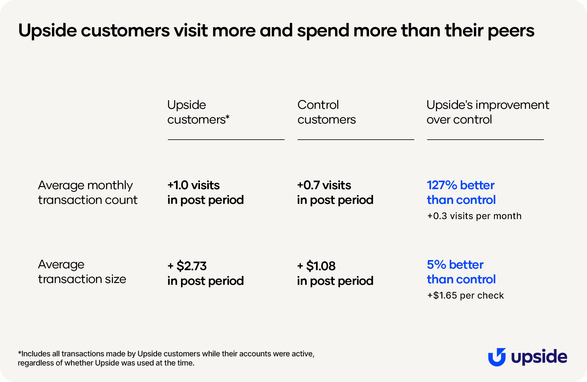 The independent, third-party measurement found that Upside customers visited more and spent more per trip than their peers.