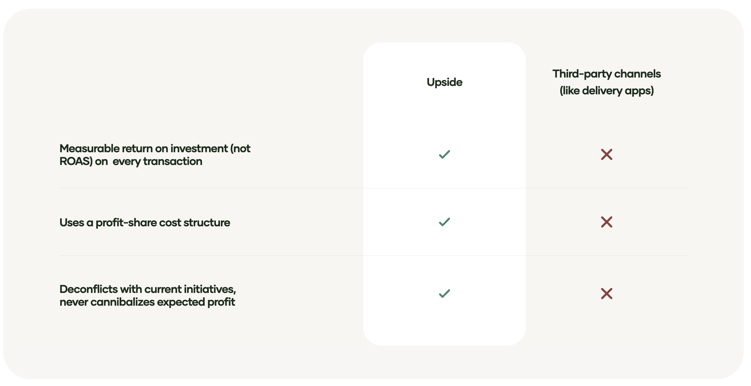 Unlike traditional advertising, where you pay upfront with uncertain results, Upside operates on a profit-share model where you only pay when we prove incremental customer visits.