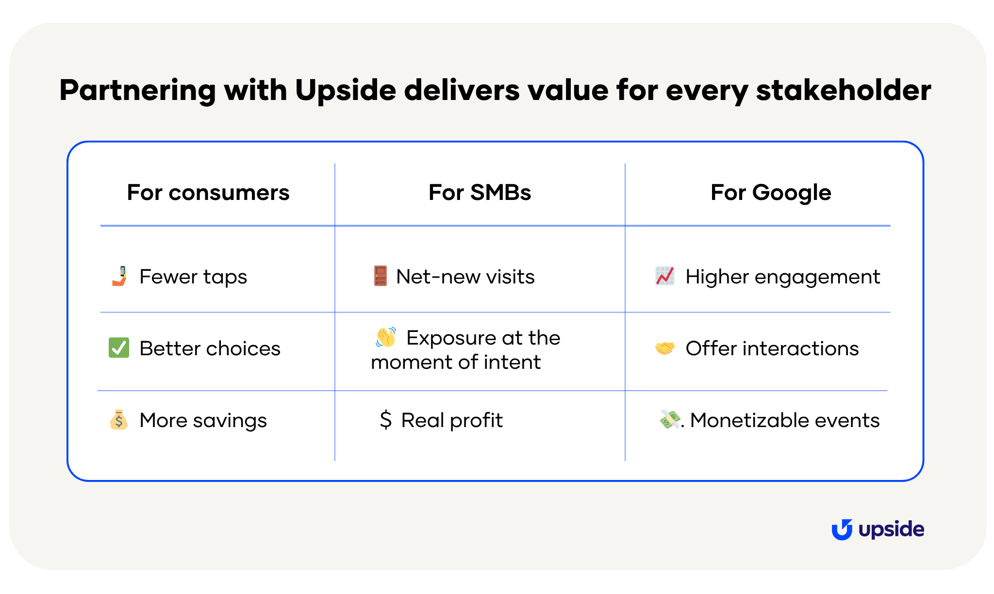 There’s clear appetite for Upside offers in Google Maps, and we’re ready to deliver — for consumers, for SMBs, and for Google.