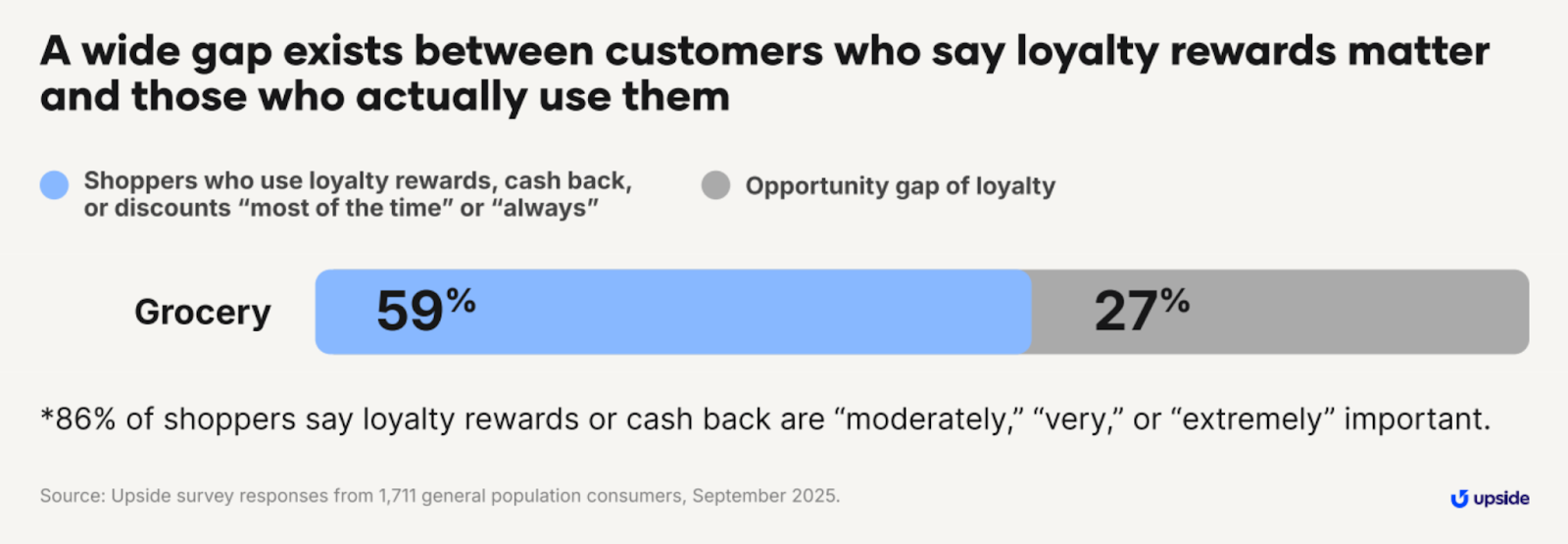 Upside’s research found a 30 percentage-point gap between consumers who say loyalty rewards matter and those who actually use a program regularly. Nearly half of the retailers we surveyed confirmed it: participation wasn't improving, and neither was loyal customer behavior.
