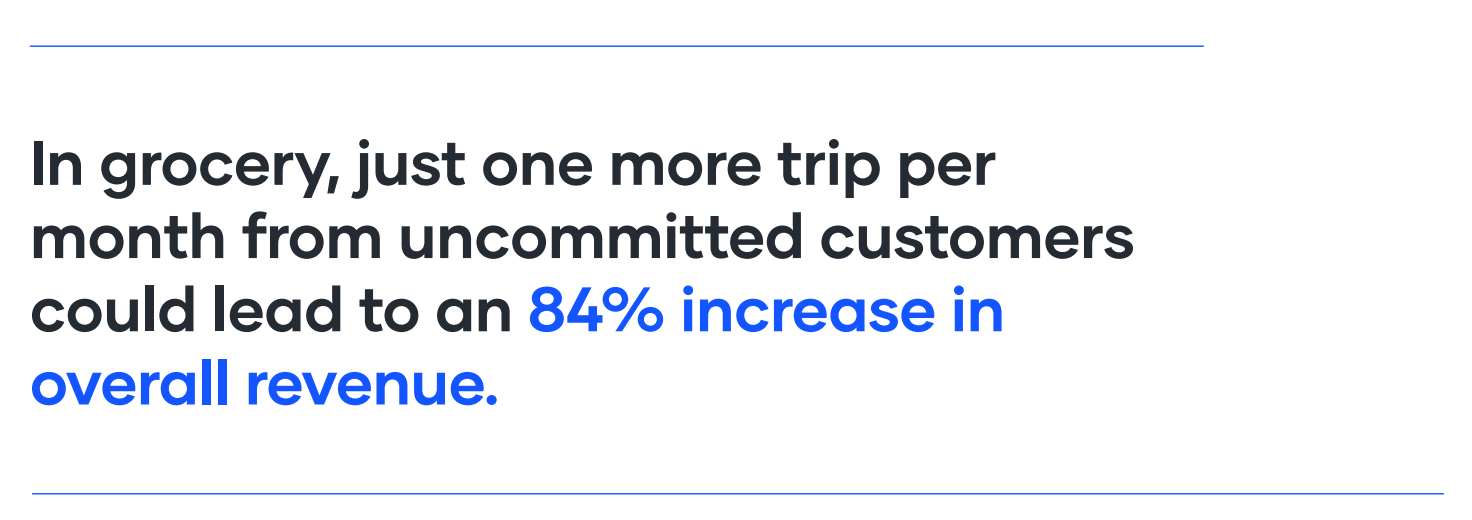 The opportunity is significant. These customers account for 72% of revenue at the average grocer, and just one more trip per month from each uncommitted shopper could increase overall revenue by 84%. Getting them to change their behavior, Mark explained, is a matter of forming habits.