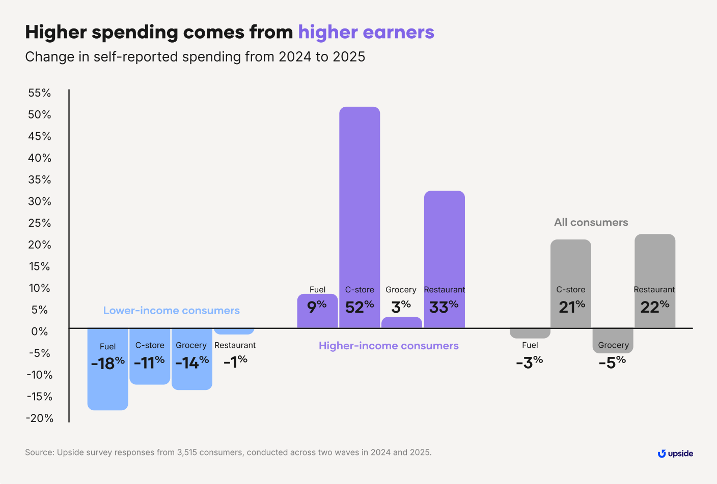 Households earning above that level expressed optimism and reported spending more than the prior year. Below that threshold, households reported cutting back in every category we measured: grocery, fuel, and restaurants.