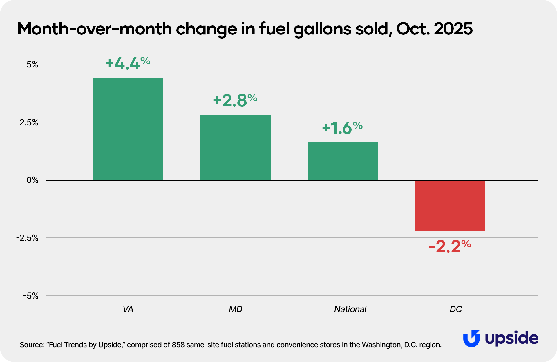 Month-over-month, fuel prices dipped in October due to expected changes in seasonal demand and the switch over to a lower-cost winter blend of gasoline. We highlighted that earlier. Stations in Virginia (+4.4%) and Maryland (2.8%) stations also saw a bump in demand, like the rest of the country.